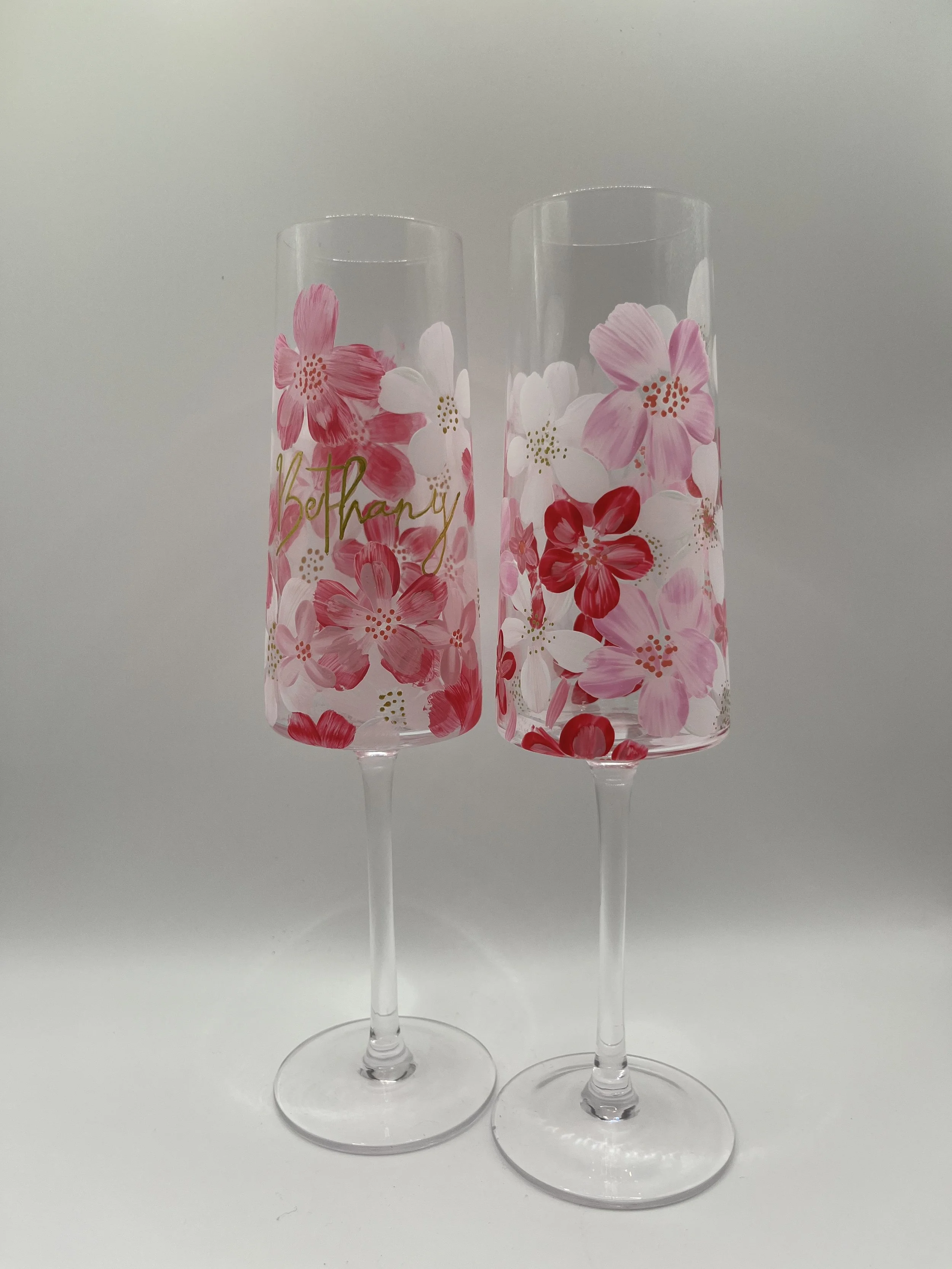 A beautiful set of hand-painted flutes, perfect for champagne or prosecco, personalised just for you. Perfect for celebrating special moments such as birthdays, anniversaries, engagements or weddings. Each glass is individually painted by hand, making every set completely unique.