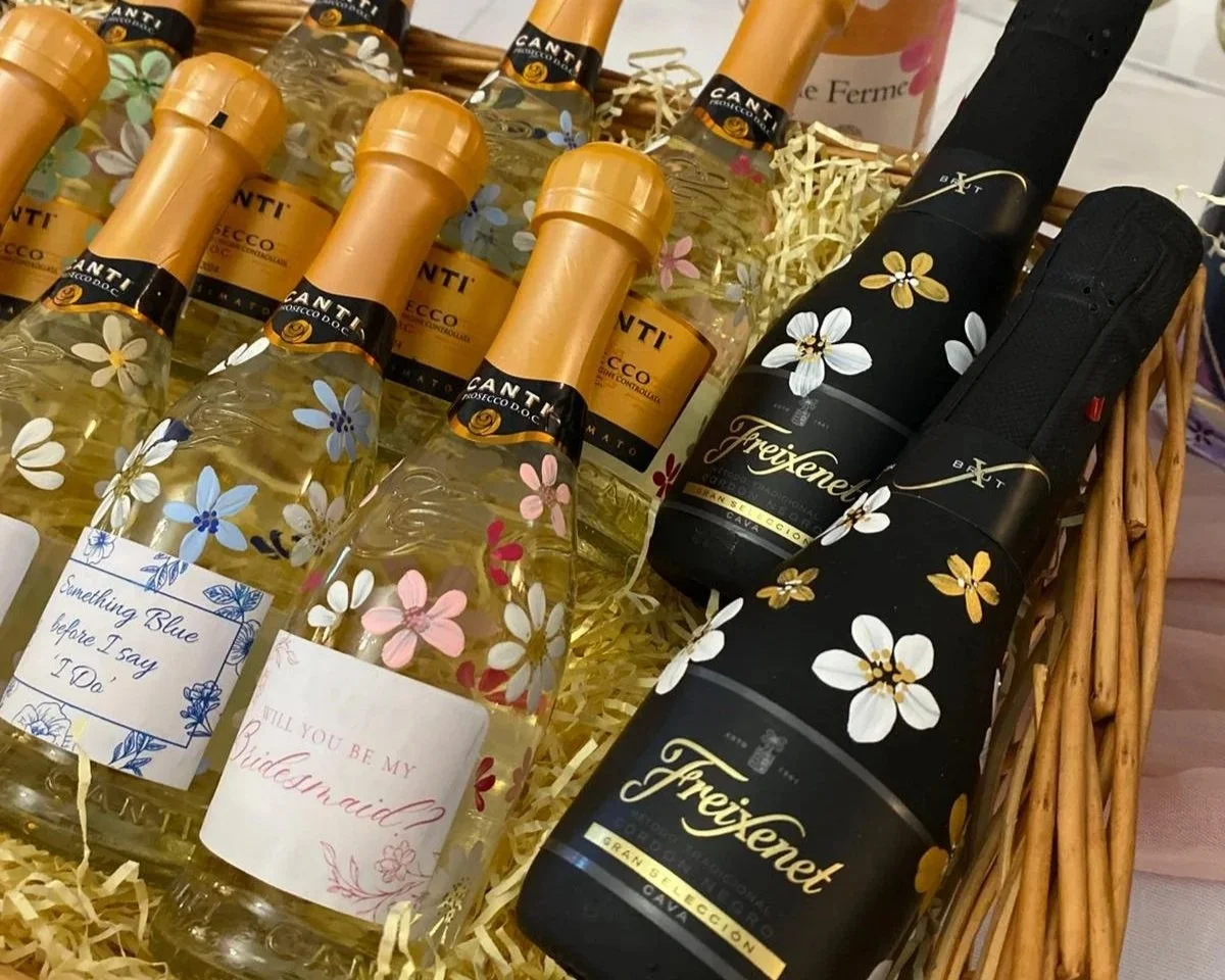 A fun and eye-catching set of six hand-painted mini prosecco bottles. Ideal for hen parties, bridal showers or celebration tables, each mini bottle is painted by hand and can be personalised to match your theme or event.